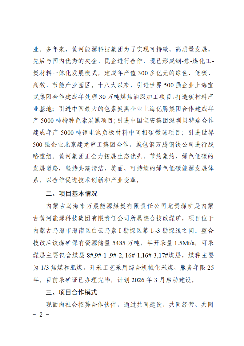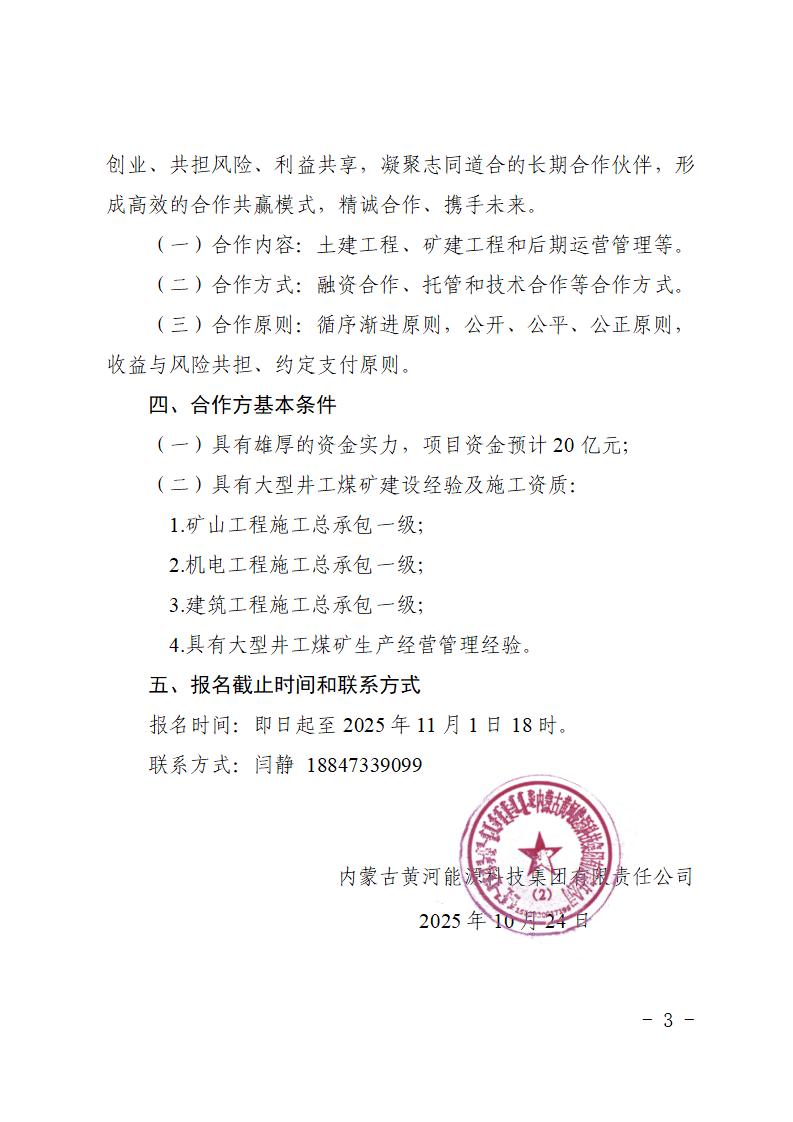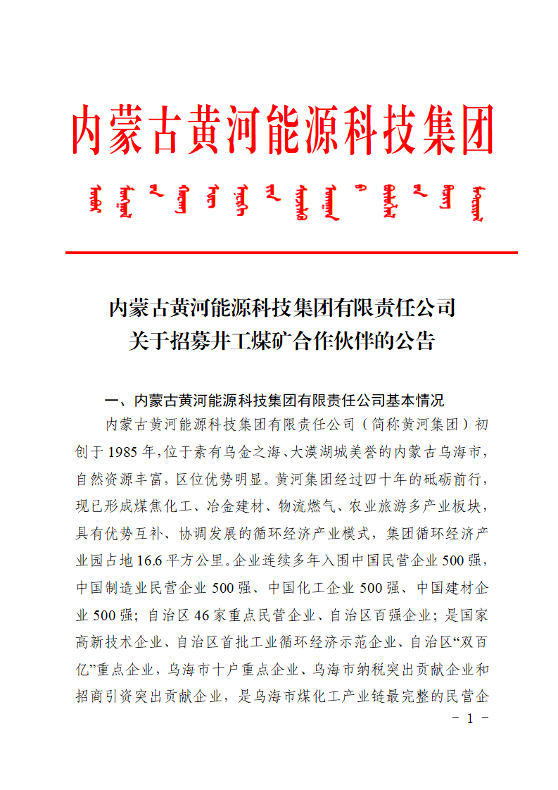 內(nèi)蒙古黃河能源科技集團有限責(zé)任公司關(guān)于招募井工煤礦合作伙伴的公告